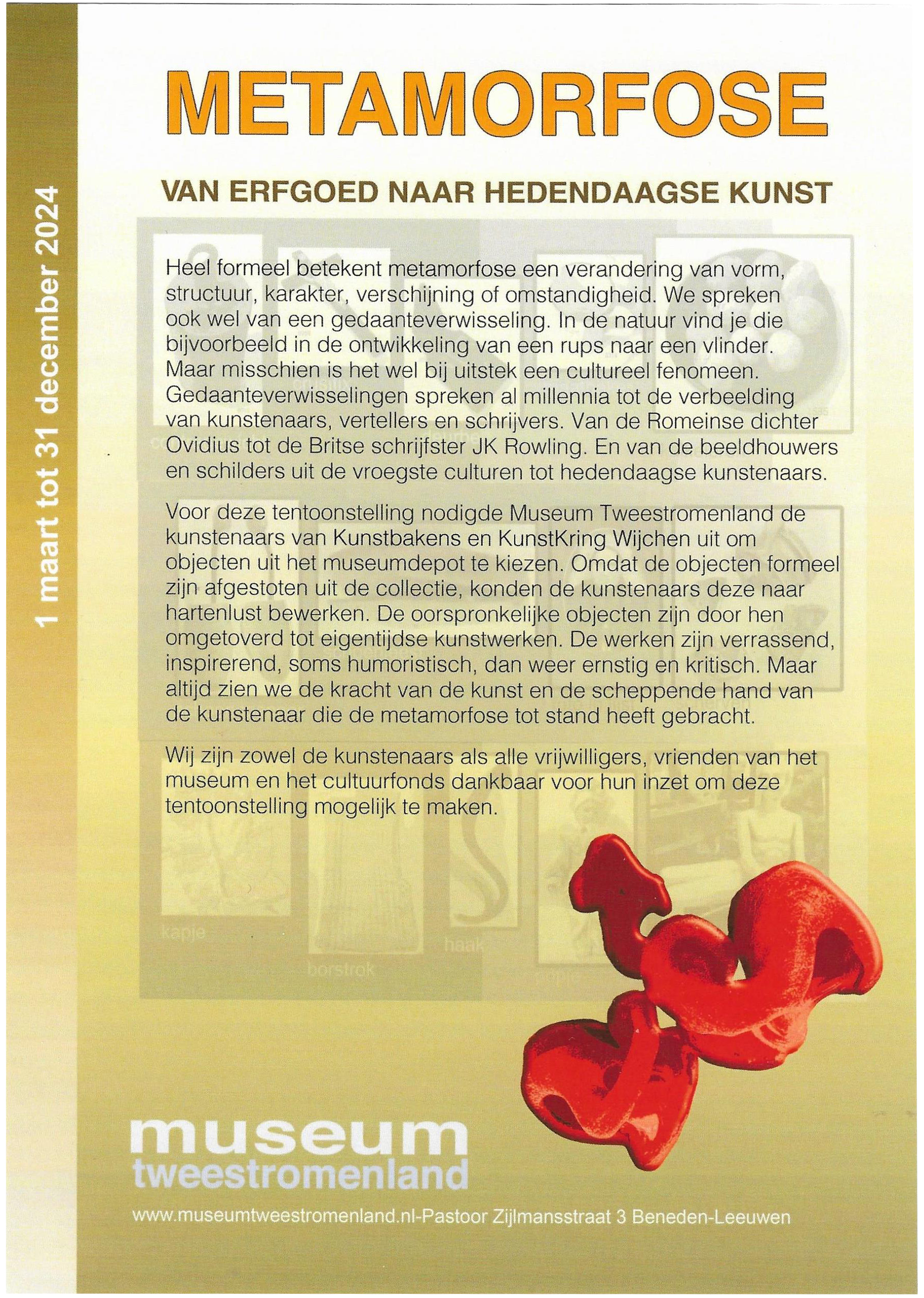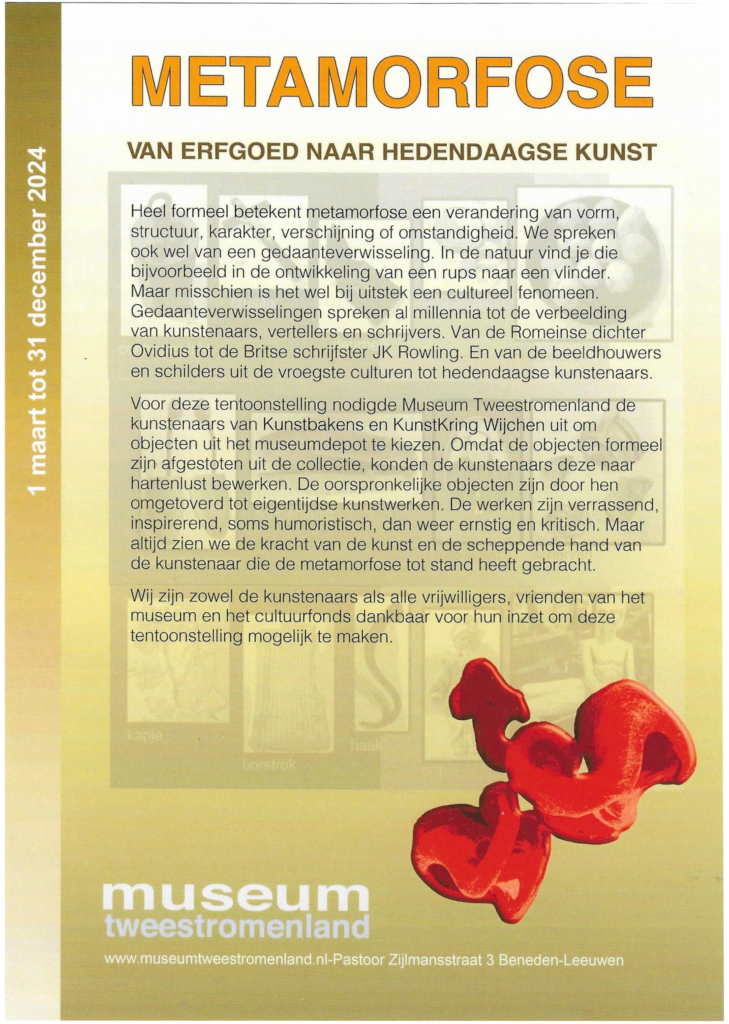 Vrijdag 1-3-2024 wordt de groepsexpositie ‘Metamorfose‘ in het Museum Tweestromenland in Beneden Leeuwen geopend. De expositie, waar Yvonne Gilsing aan deelneemt, zal een jaar te bezoeken zijn. Klik op de foto’s voor meer info.